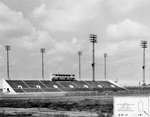 A black and white photograph of the Memorial Stadium stands at the end stage of their construction, as seen from the field and facing northwest. [typed inscription] STADIUM, EAST TEXAS STATE TEACHERS COLLEGE, COMMERCE, TEXAS. GEORGE L. DAHL, Architects & Engineers. FARNSWORTH & CHAMBERS CO. Inc., General Contractors & Engineers. Date: 9-18-1950 Photo #14