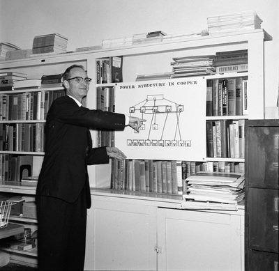 A black and white negative of sociology professor Jewel David Kennemer in his office. He is pointing to a chart with the title "POWER STRUCTURE IN COOPER".