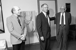 A black and white negative of former ETSU art professor Karl Umlauf, University President Dr. Jerry D. Morris, and former president Frank Henderson "Bub" McDowell inside of Gee Library (now Velma K. Waters Library) at the unveiling ceremony of the H.M. "Jim" Lafferty Art Collection. The collection consists of artworks donated by Umlauf and was displayed in several buildings throughout the campus in tribute to Lafferty's dedication to higher education.