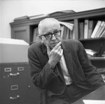 A black and white negative of professor of secondary and higher education and director of Organized Research, Dr. Harry Montgomery "Jim" Lafferty seated in his office. Lafferty was a faculty member from 1936-1981 and was named Professor Emeritus in 1990.