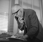 A black and white negative of professor of secondary and higher education and director of Organized Research, Dr. Harry Montgomery "Jim" Lafferty on a phone call. Lafferty was a faculty member from 1936-1981 and was named Professor Emeritus in 1990.