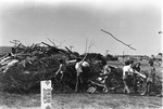 A black and white photograph of students building the Homecoming bonfire.