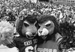 The front side of a black and white photograph of lion mascots Lucy and Lucky the Lion waving pom-poms at a football game.