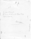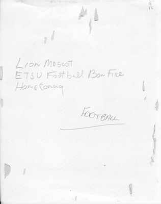 The reverse side of a black and white photograph of lion mascot Lucky the Lion performing with ETSU Cheerleaders during the Homecoming bonfire. [handwritten note in center] Lion Mascot ETSU Football Bon Fire Homecoming Football