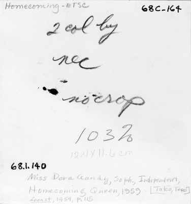 The reverse side of a black and white photograph of Dora Gandy of Talco, Texas. She was crowned the East Texas State Homecoming Queen on October 4, 1958. This image was published in the 1959 Locust Yearbook. [handwritten note at bottom] Miss Dora Gandy, Soph., Independent, Homecoming Queen, 1959 [Talco, Texas] Locust, 1959, p. 115