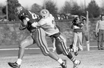 A black and white negative of an East Texas State player tackling a Pittsburg State player during a game between East Texas State University and Pittsburg State University.