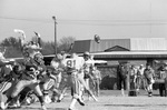 A black and white negative of players including Shannon Murphy (#81) and Micah Haley (#65) attempting to block a kick during a game between East Texas State University and Pittsburg State University.
