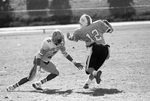 A black and white negative of Frank Roberts (#2) attempting to tackle a runner with the ball during a game between East Texas State University and Grand Valley State University.