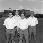A black and white negative group photo of the 1990 ETSU Football staff.