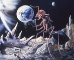 A color slide of a painting of a giant ant in outer space standing upon an alien planet and consuming the Earth. Created by an unknown art student.