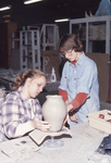 A color slide of Barbara Frey, Art Department faculty, instructing a ceramics student.