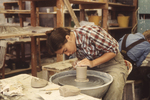 A color slide of a ceramics student shaping a clay vessel on a pottery wheel.