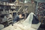 A color slide of a ceramics student sculpting a tree out of clay.