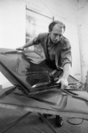 A black and white negative of Art Department Professor Karl Umlauf constructing one of his vacuum form pieces.