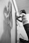 A black and white negative of Bruce Peter Tibbetts, painting instructor in the Art Department, working on a large scale painting of a female figure.