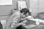 A black and white negative of Professor Lee Baxter Davis, graphics and printmaking instructor in the Art Department, working on an etching.
