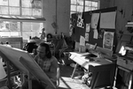 A black and white negative of an art student drawing at a drafting table in his studio space.