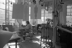 A black and white negative of an art student drawing at a drafting table in his studio space.