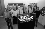 A black and white negative of the Art Department Faculty. Pictured from left to right, front row: Lee Baxter Davis, Charles McGough, Bill Wiman, Gordon Young. Back row: James Watral, Bill Lamb, James Allumbaugh, Jack Unruh, Richard Johnson.