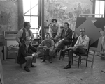 A black and white negative of the Art Department faculty. Pictured from left to right: Gordon Young, Richard A. Johnson, William "Bill" Lamb, Bruce Tibbetts, James Watral, Bill Wiman.