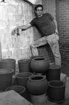 A black and white negative of Art Department Professor James Bacon standing in a newly constructed brick ceramics kiln, which was located on the west side of the first floor of the art building.