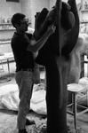A black and white negative of Art Department Professor James Bacon sculpting a large abstract figural sculpture out of clay.