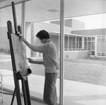 A black and white negative of an art student painting at an easel in a studio the Art Building. The Old Music Building is visible through the large windows behind her.