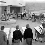 A black and white negative of art students seated at drawing horses (benches) and drawing a live model in a figure drawing class.